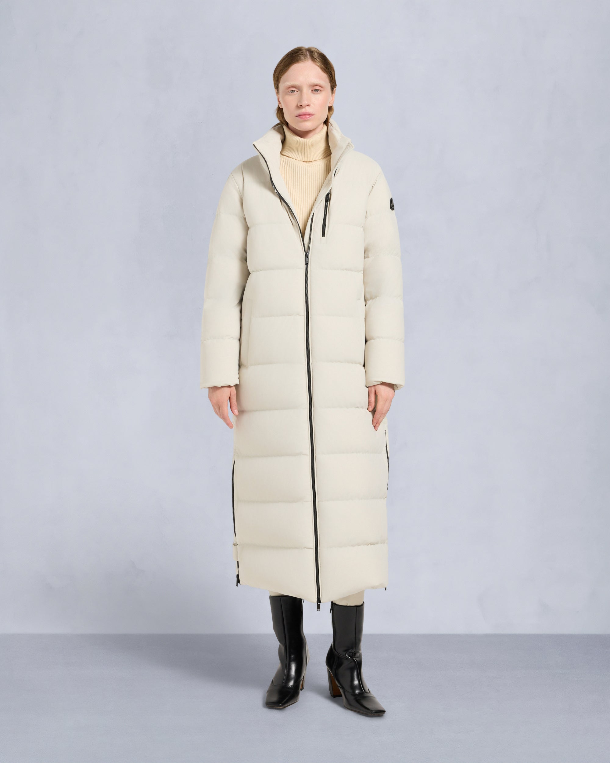 Refinement meets comfort with the Chelia Parka. With an easy. relaxed fit and super-warm 90/10 down and a water-repellent. wind-resistant shell. it offers full coverage with more than a touch of glamour. A removable two-way hood with detachable shearling trim adds versatility while rib knit storm cuffs and side-seam zip opening levels up utility and breathability. The Nyluxe fabric is woven for durability all season. and a soft handfeel.