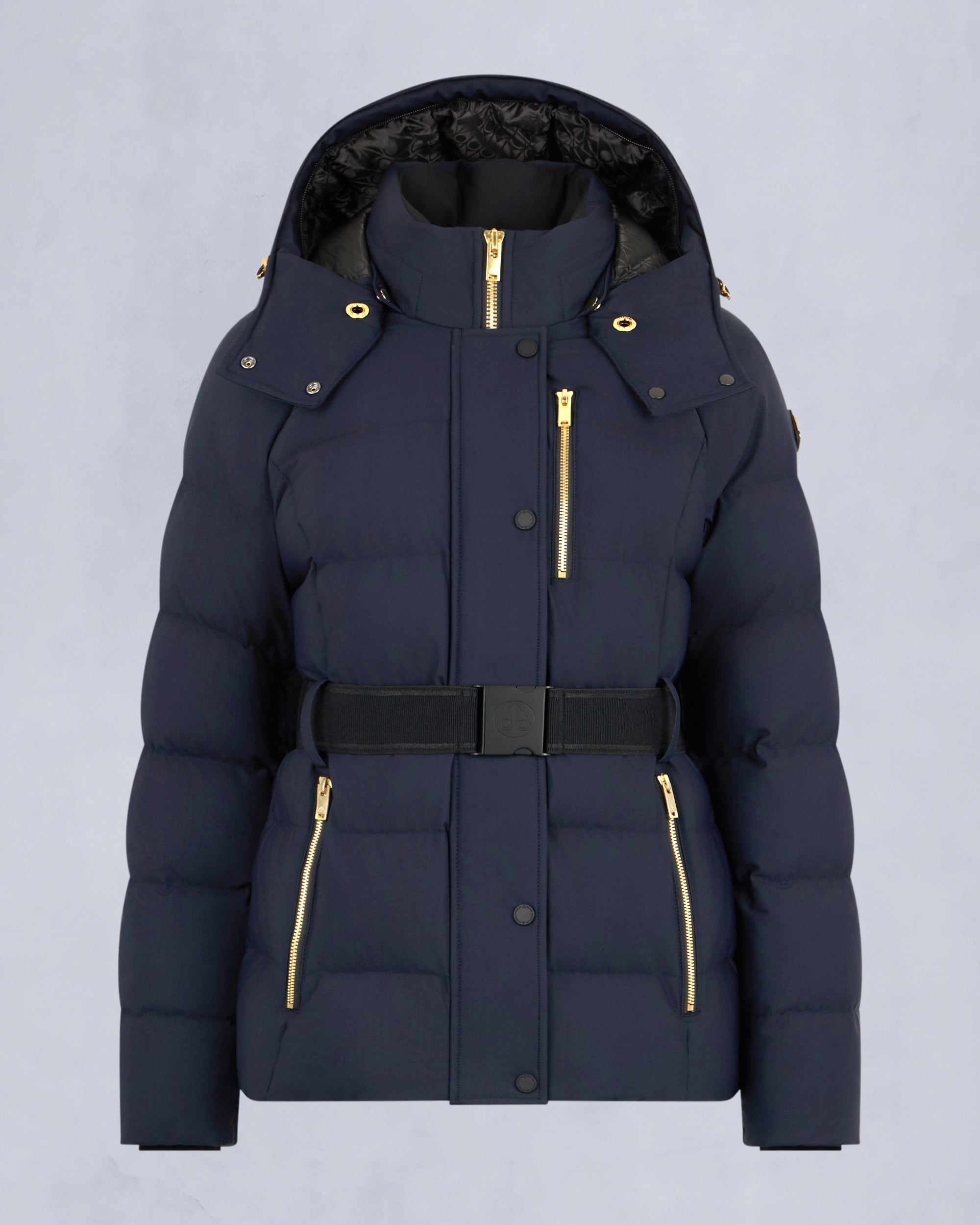 Chic tailoring meets high-performance warmth. Breathable. yet made from 90/10 goose down with a wind-repellent. wind-resistant outer. it features a cozy removable hood with detachable shearling and pom poms plus a down-filled collar. and 2-way Metaluxe zipper. The removable elasticized belt makes for a customizable element in this versatile easy-to-wear piece. The Nyluxe fabric is woven for durability all season. and a soft handfeel.